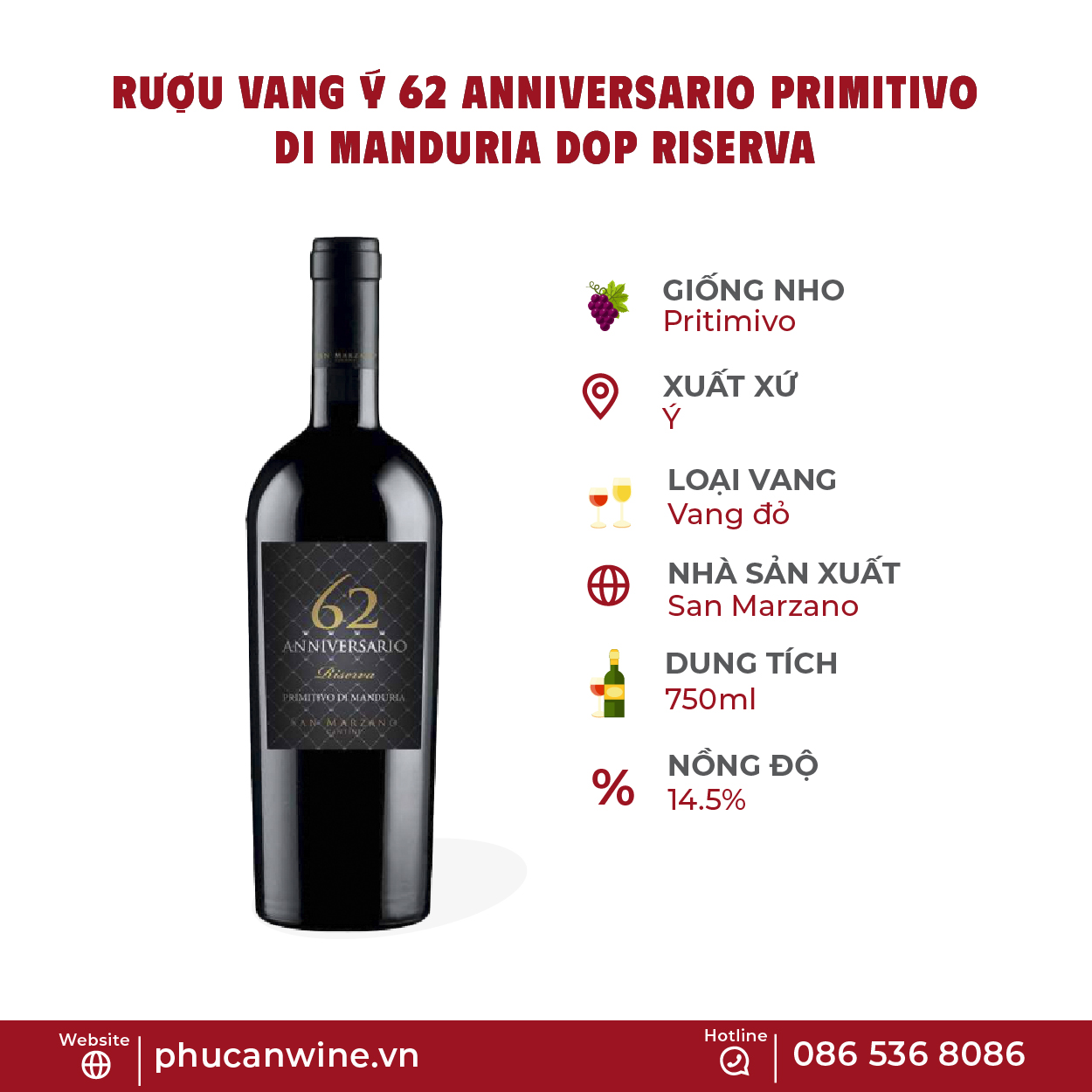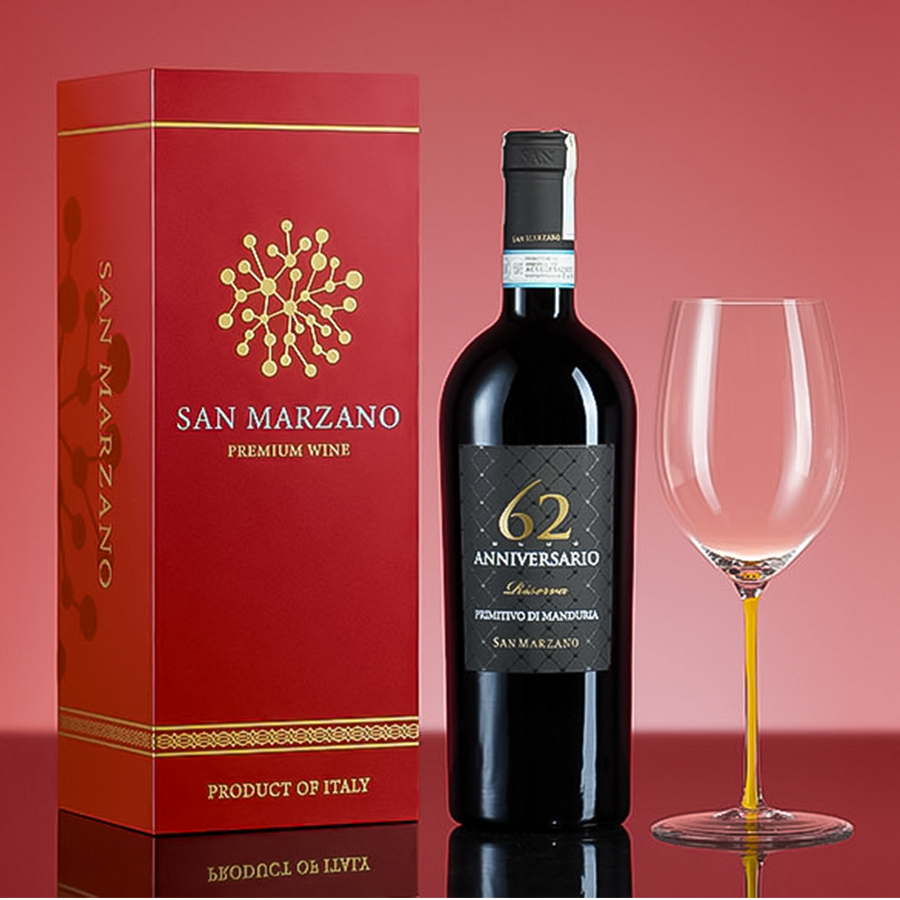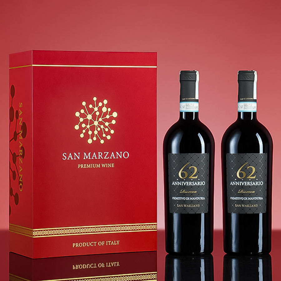 Rượu Vang Ý 62 Anniversario Primitivo di Manduria DOP Riserva là một nhãn vang mang nhiều lớp nghĩa: vừa là sản phẩm thể hiện đẳng cấp của giống nho Primitivo di Manduria, vừa là dấu mốc nhắc lại lịch sử hình thành của nhà San Marzano. Về cảm quan, rượu gây ấn tượng với sắc đỏ ruby rất đậm, hương mận chín, mứt anh đào, thuốc lá, ca cao, cà phê, vani, cùng thân rượu đầy, tannin mượt và hậu vị kéo dài.
